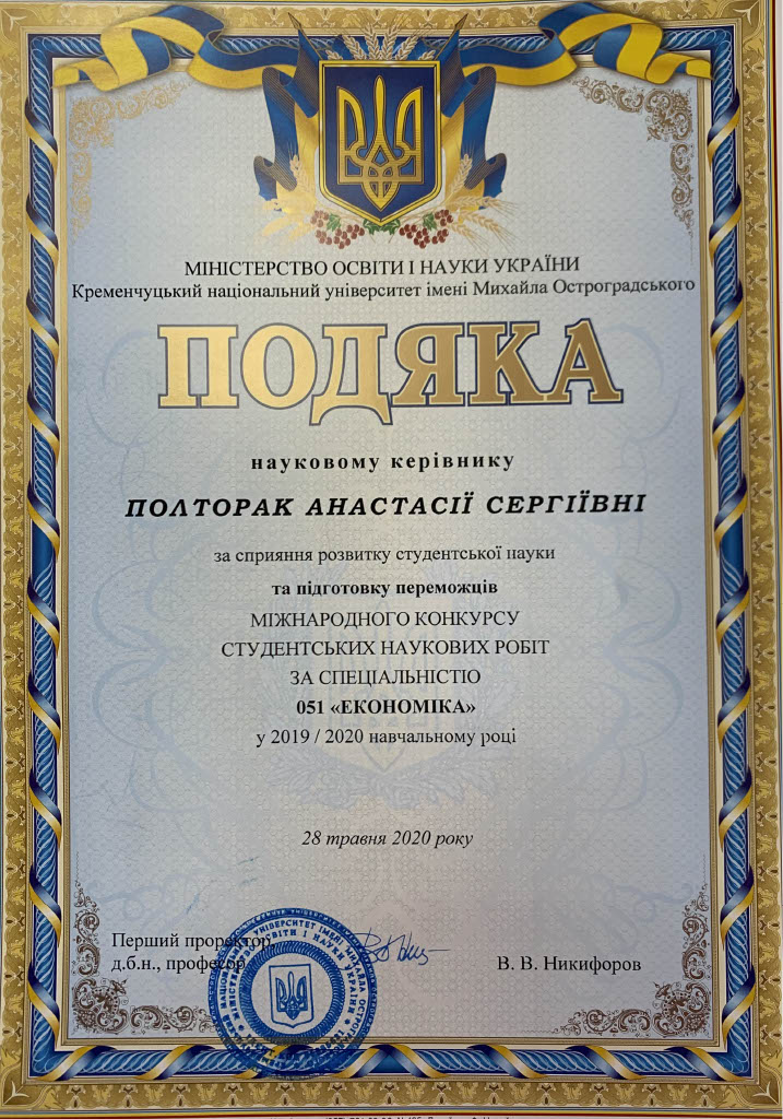 5) зі спеціальності «Економіка» (науковий керівник – канд. екон. наук, доцент кафедри фінансів, банківської справи та страхування А. С. Полторак):