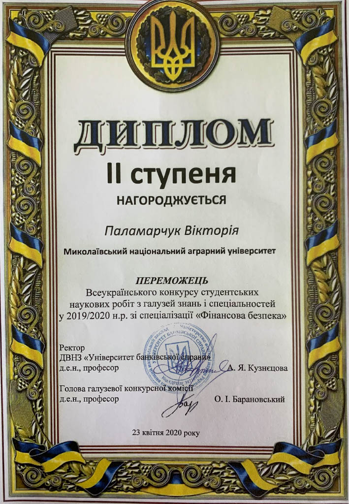 3) зі спеціальності «Фінансова безпека» (науковий керівник – канд. екон. наук, доцент кафедри фінансів, банківської справи та страхування А. С. Полторак):